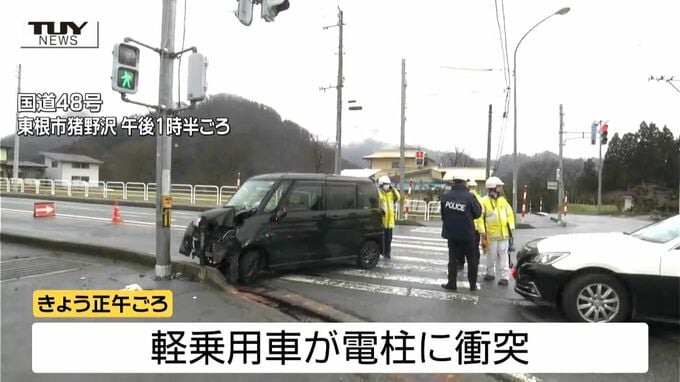 警察や消防によりますときょう午後0時半ごろ、東根市猪野沢の国道48号の交差点で、軽乗用車が電柱に衝突したということです。