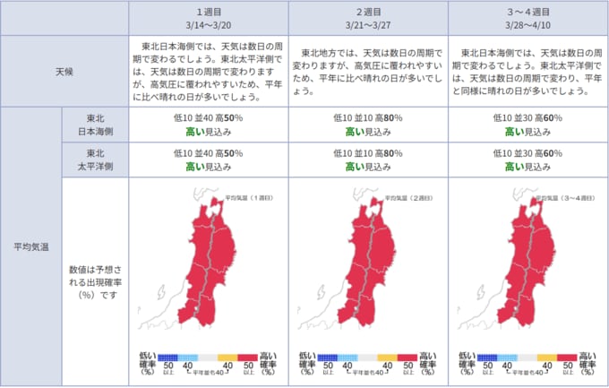 東北日本海側では、天気は数日の周期で変わるでしょう。東北太平洋側では、天気は数日の周期で変わり、平年と同様に晴れの日が多いでしょう。
