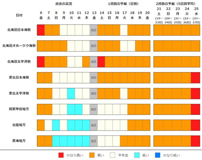 北日本の向こう2週間の気温は、暖かい空気に覆われやすいため高い日が多く、東北地方では23日頃からはかなり高くなる可能性があります。農作物の管理等に注意してください。