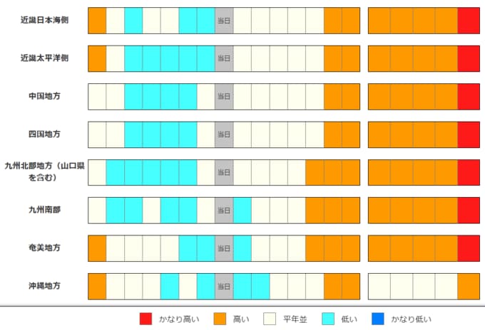沖縄・奄美の気温は、15日頃までは低い日もありますが、その後は暖かい空気に覆われやすいため平年並か高く、奄美地方では23日頃からはかなり高くなる可能性があります。農作物の管理等に注意してください。