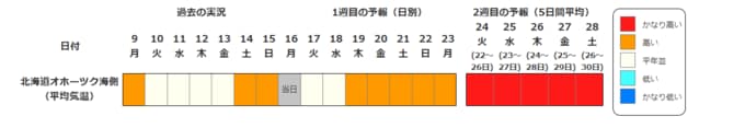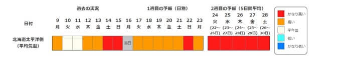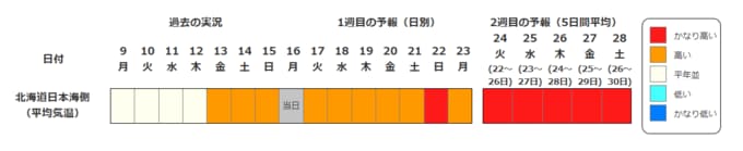 北海道地方の向こう2週間の気温は、暖かい空気が流れ込みやすいため高く、22日頃からはかなり高くなる可能性があります。農作物の管理等に注意してください。積雪の多い地域ではなだれに注意してください。また、今後の気象情報等に留意してください。