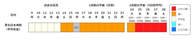 東北地方の向こう2週間の気温は、暖かい空気が流れ込みやすいため高く、23日頃からはかなり高くなる可能性があります。農作物の管理等に注意してください。積雪の多い地域ではなだれに注意してください。また、今後の気象情報等に留意してください。