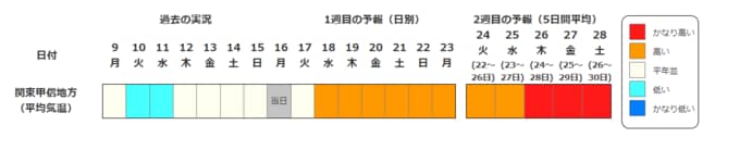 関東甲信地方の向こう2週間の気温は、暖かい空気が流れ込みやすいため高く、24日頃からはかなり高くなる可能性があります。農作物の管理等に注意してください。積雪の多い地域ではなだれに注意してください。また、今後の気象情報等に留意してください。