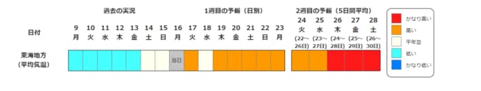 東海地方の向こう2週間の気温は、暖かい空気が流れ込みやすいため高く、24日頃からはかなり高くなる可能性があります。農作物の管理等に注意してください。積雪の多い地域ではなだれに注意してください。また、今後の気象情報等に留意してください。