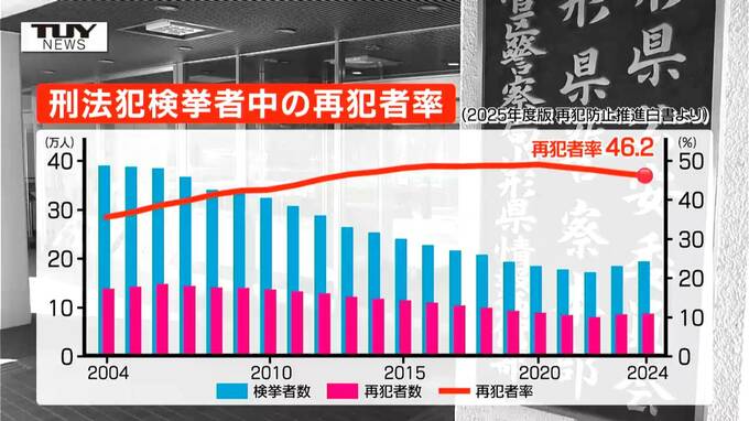 全国的に刑法犯の検挙件数は以前に比べ減りました。しかし、再び罪を犯して検挙された人の数は大きくは減っておらず、いま検挙された人の2人に1人が、再び罪を犯している状況となっています。