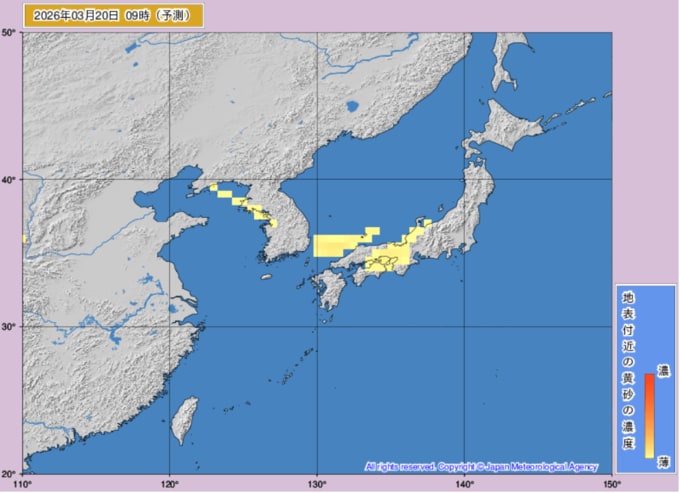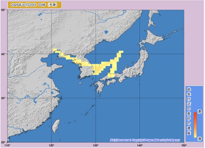 【黄砂情報】20日は日本に黄砂飛来か...黄砂シミュレーション いつどこに、どれくらい飛んでくる? 黄砂を上空から見たデータで確認 気象庁発表 今後の天気を画像で 2026年3月17日(火) 11:03 国内 ■黄砂はいつ・どこに飛んでくる?(20日)