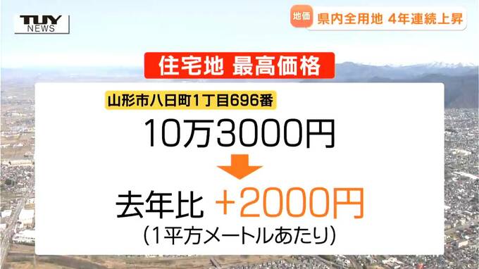 なお、住宅地の最高価格になった山形市八日町1丁目696番は1平方メートルあたり10万3000円で、去年と比べて2千円上昇しています。