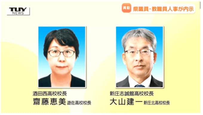 酒田西高校の校長に、齋藤恵美遊佐高校校長。また、ことし4月に開校する新庄志誠館高校の校長には、大山建一新庄北高校校長が起用されます。