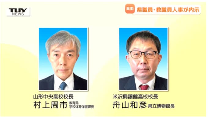 山形中央高校の校長に、村上周市教育局学校体育保健課長。米沢興譲館高校の校長に、舟山和彦県立博物館長。