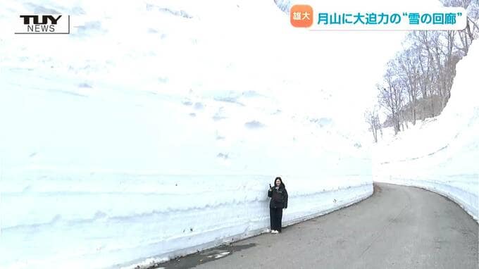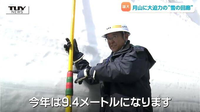 大塚美咲アナウンサー「雪の壁が一番高い地点に来ました。9.4メートル、私の身長のおよそ6倍の高さです。下から見上げると、この景色!ダイナミックな光景です」