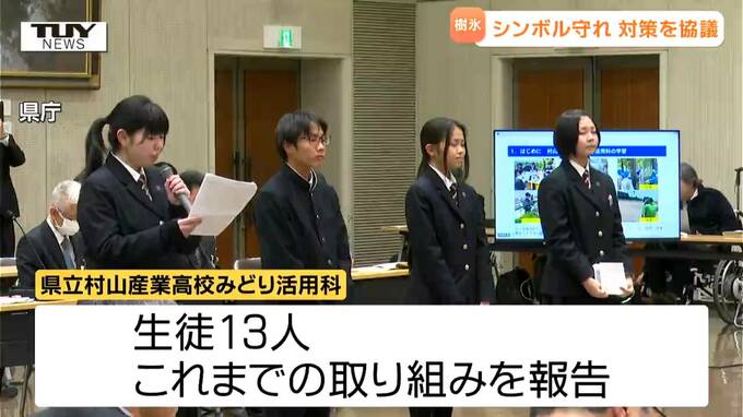 きょうは、オオシラビソの生態調査や植樹活動を続ける県立村山産業高校・みどり活用科の生徒13人が、これまでの取り組みを報告しました。