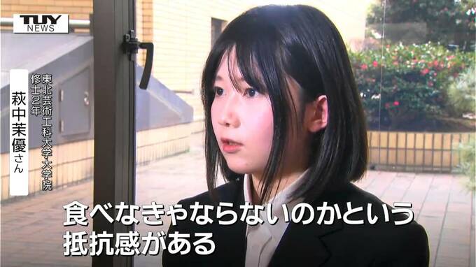 東北芸術工科大学大学院 修士2年 萩中茉優さん「食べるために売られているので、それをいざ食べるとなって目の前にしたときに、食べなきゃならないのかという抵抗感がある。それを加工して食べるくらいなら、手が生えたり足が生えたりして何処かに行ってくれないかな」