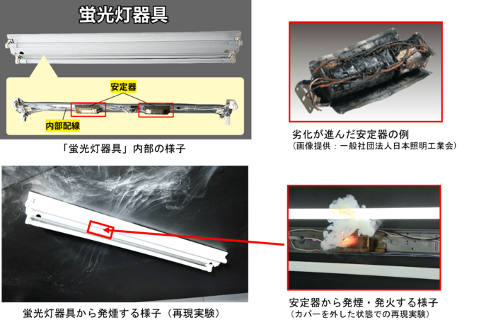 なぜLED化に注意が必要?LED照明をそのまま使える条件は?蛍光灯製造終了…見た目はピカピカ、中身は劣化 10年超えの蛍光灯器具に専門機関NITEが注意を呼びかけ(山形) 2026年3月28日(土) 06:57 国内 こんな症状があれば、すぐに使用中止! 以下のような異常がある場合は、発煙・発火につながるおそれがあるため、直ちに電源を切ってください。(画像 発火か所はここだ) ○点灯時にちらつく ○異音がする ○焦げたにおいがする