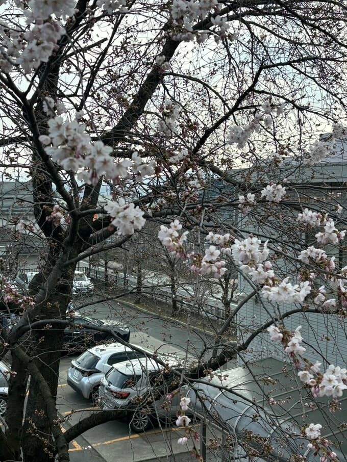 TUY放送センターでは、毎年開花予想日の1週間ほど前に桜の花が咲きはじめていてます。