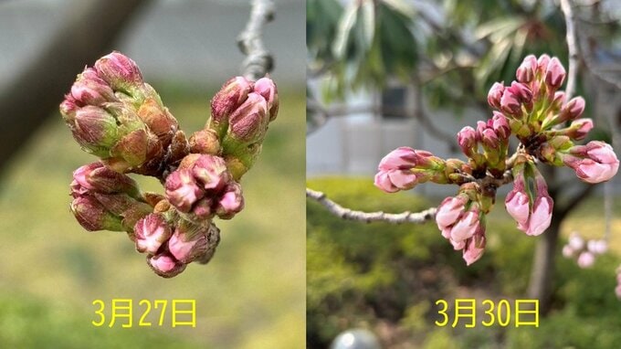 とはいえ、まだつぼみの状態のものもありますが、きょう(30日)と先週金曜日(27日)を比較すると、明らかに先端から見える花びらの面積が違うことがわかります。