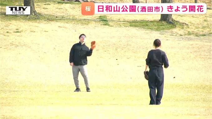 酒田ではきょう日中の最高気温が21.1度となり暖かい海風が吹く中、公園ではキャッチボールをする人の姿がありました。