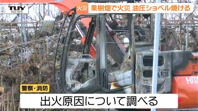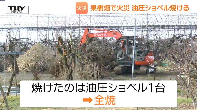 天童市川原子では果樹畑で火災がありました。警察によりますと、焼けたのは油圧ショベル1台で全焼とみられています。