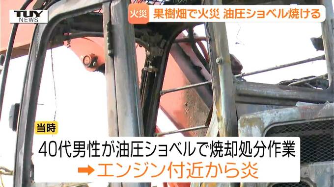 当時、所有者から依頼を受けた40代男性が油圧ショベルで果樹を掘り起こし、焼却処分をしていたところ、エンジン付近から炎が出たということです。