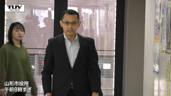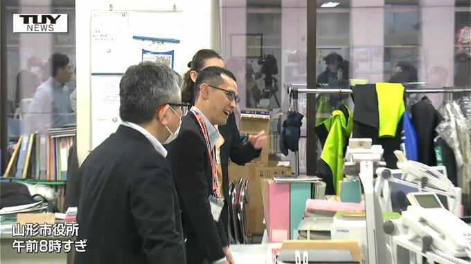 けさ、スーツ姿で山形市役所に出勤した内藤智文選手。同僚と和やかに談笑する姿が見られました。