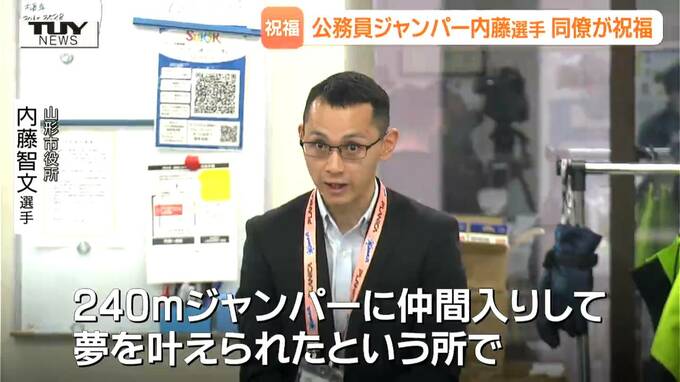 山形市役所 内藤智文 選手「世界に10数人しかいない240メートルジャンパーに仲間入りして、夢を叶えられたという所で、本当に皆さんのご支援あってのことだなと思って感謝の気持ちでいっぱいです。仕事をちょっと忘れているので、お世話になりますのでよろしくお願いします」
