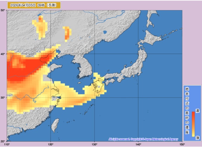 【黄砂情報】5日は九州地方、中国地方、四国地方に黄砂飛来か...4日~5日の黄砂シミュレーション いつどこに、どれくらい飛んでくる? 黄砂を上空から見たデータで確認 気象庁発表 全国の天気を画像で 2026年4月2日(木) 20:58 国内 ■黄砂はいつどこに?(5日) ※画像は気象庁より