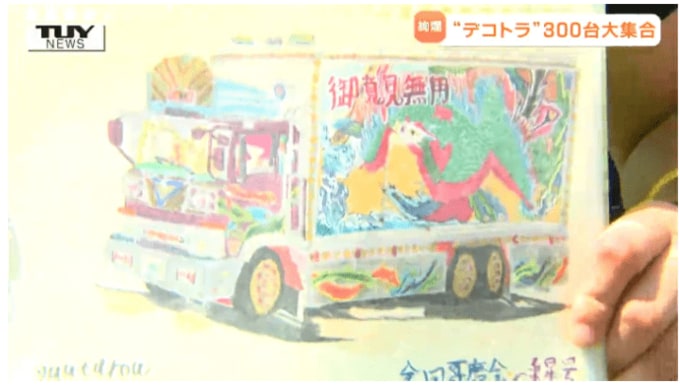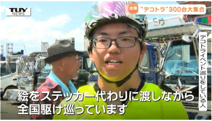 デコトライベントを回っている人「以前からドライバーにステッカーをいただいていて、申し訳ないなと思って、絵をステッカー代わりに渡しながら、全国駆け巡っています」