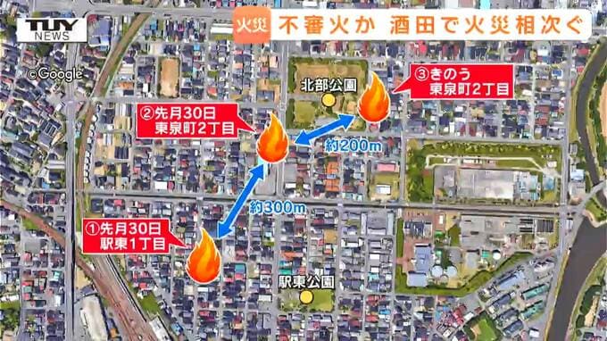 そのおよそ2時間後には、そこからおよそ300メートル北西に位置する東泉町二丁目で発生。こちらも一般住宅の物置小屋が焼けたということです。