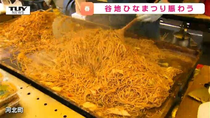 佐藤友美アナウンサー「谷地ひなまつりでは、春休みということもあって小学生や親子連れの姿が見られます。こちらには屋台がずらっと並んでいて、賑わっていますね」