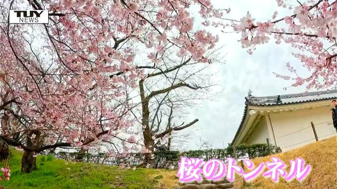 上を見上げると柔らかいピンク色の桜のトンネル。春の訪れを楽しもうと、県内外から多くの人が訪れました。
