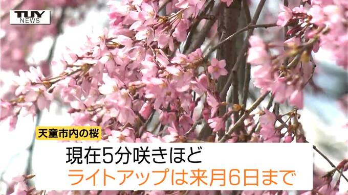 天童市によりますと、市内の桜は現在5分咲きほどで、夜桜のライトアップは来月6日まで行われる予定です。