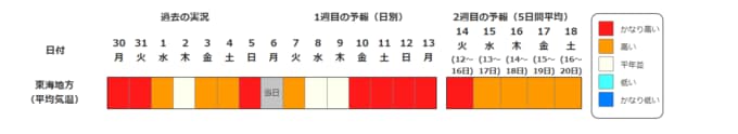 東海地方の向こう2週間の気温は、暖かい空気が流れ込みやすいため高い日が多く、10日頃からはかなり高くなるでしょう。農作物の管理等に注意してください。また、今後の気象情報等に留意してください。