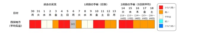 四国地方の向こう2週間の気温は、暖かい空気が流れ込みやすいため高い日が多く、かなり高い日もあるでしょう。農作物の管理等に注意してください。また、今後の気象情報等に留意してください。