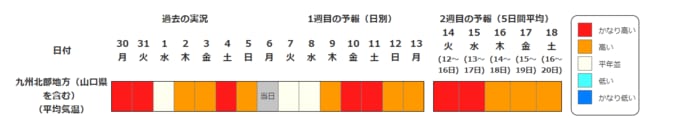 九州北部地方(山口県を含む)の向こう2週間の気温は、暖かい空気が流れ込みやすいため高い日が多く、かなり高い日もあるでしょう。農作物の管理等に注意してください。また、今後の気象情報等に留意してください。