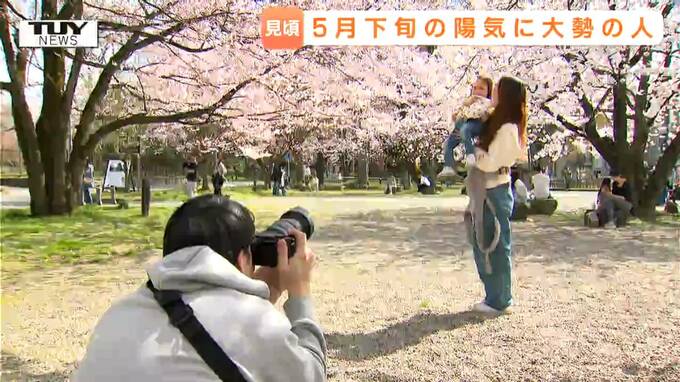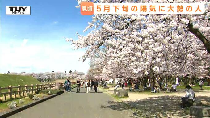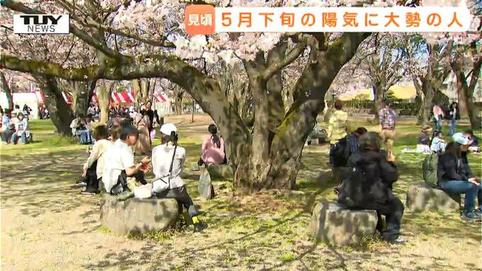 きょうは各地気温が上がり多くの地点で5月下旬並みの陽気となりました。山形市の霞城公園では多くの桜が満開となり、平日ながら大勢の人でにぎわっていました。