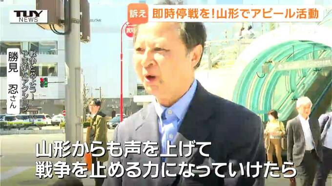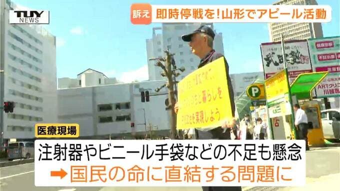 山形駅前で停戦の呼びかけなどのアピール行動を行ったのは、山形県労働組合総連合や医療関係者などからなるおよそ30人です。