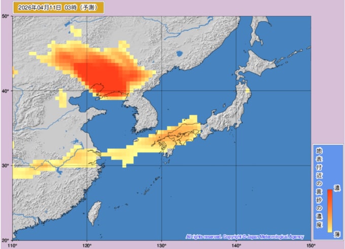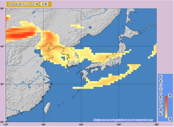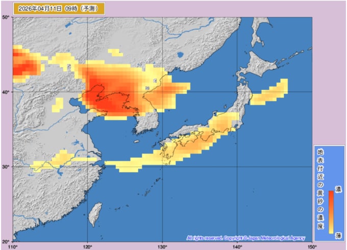 【黄砂情報】11日は日本列島の広範囲に黄砂飛来か...10日~12日の黄砂シミュレーション いつどこに、どれくらい飛んでくる? 黄砂を上空から見たデータで確認 気象庁発表 全国の天気を画像で 2026年4月9日(木) 11:03 国内 ■黄砂はいつ・どこに(11日)
