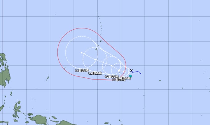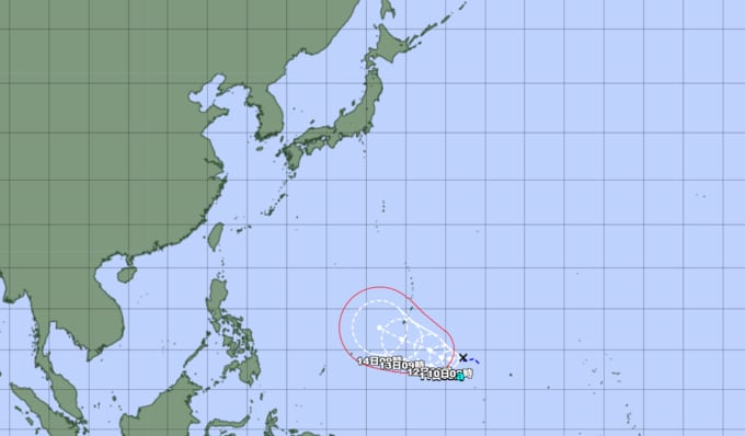 進行方向、速さ 西北西 15 km/h (8 kt)