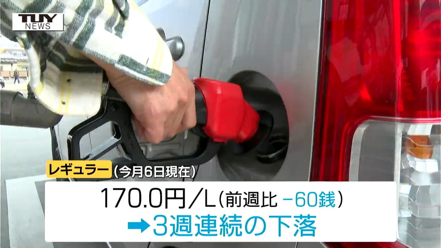 資源エネルギー庁によりますと、今月6日時点の県内レギュラーガソリンの平均小売価格は、1リットルあたり170円でした。前の週より60銭値下がりし、3週連続の下落です。