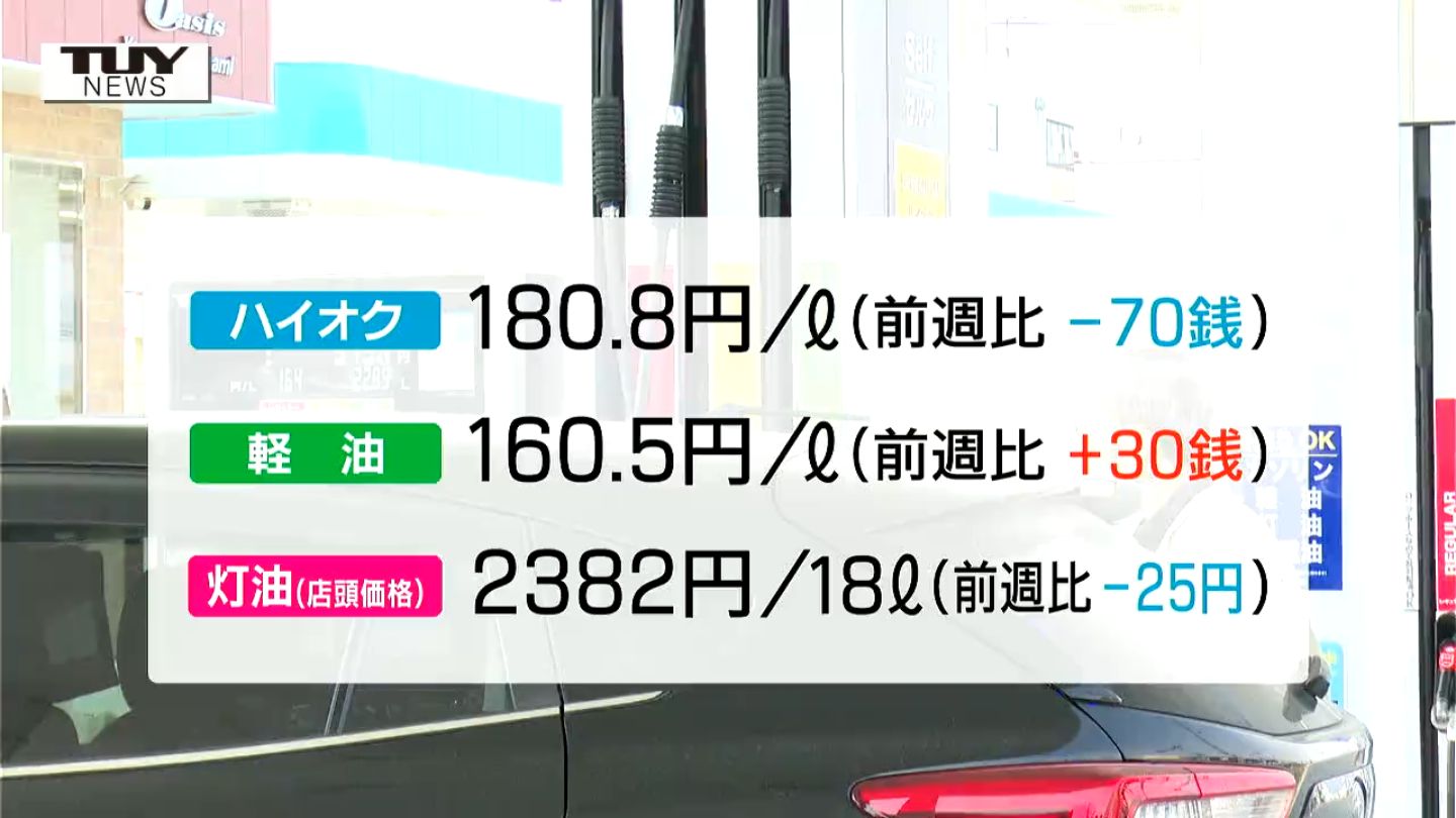 ハイオクは180円80銭で、70銭の値下がり。軽油は160円50銭で、30銭の値上がりとなっています。18リットルあたりの灯油の店頭価格は2382円で25円の値下がりです。