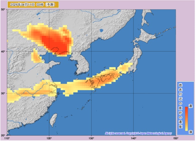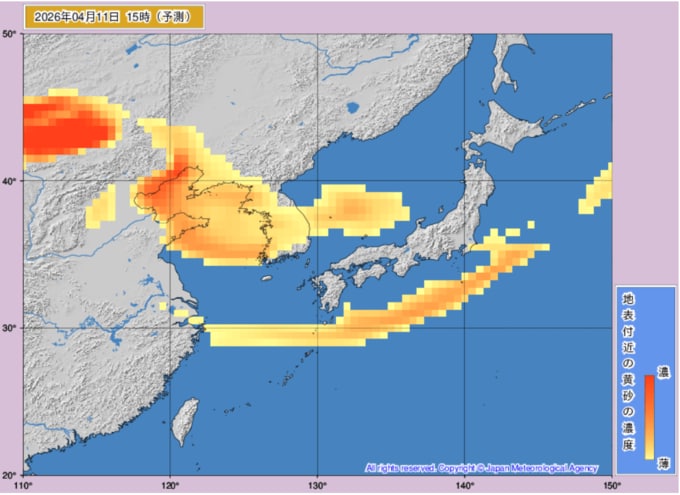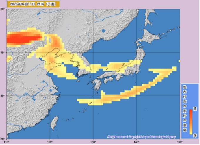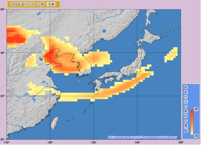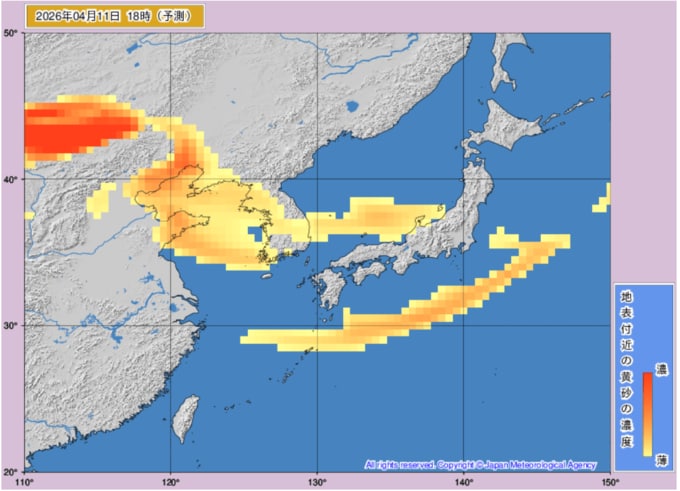 【黄砂情報】週末は日本列島の広範囲に黄砂飛来か...10日~12日の黄砂シミュレーション いつどこに、どれくらい飛んでくる? 黄砂を上空から見たデータで確認 気象庁発表 全国の天気を画像で 2026年4月10日(金) 11:22 国内 ■黄砂はいつ・どこに(11日)