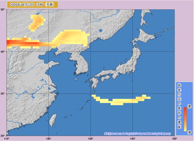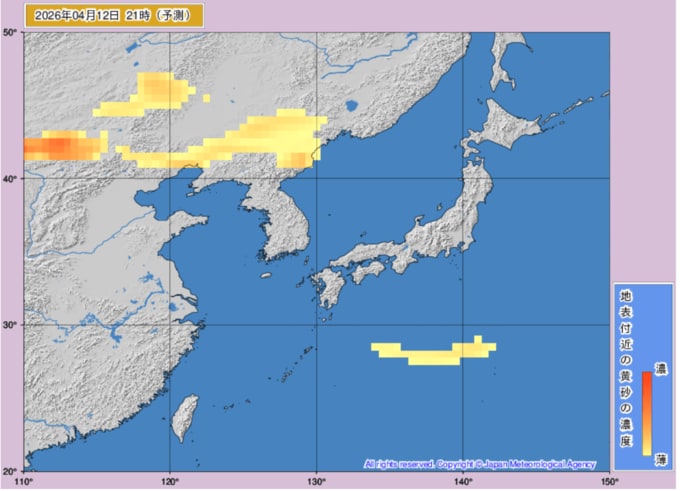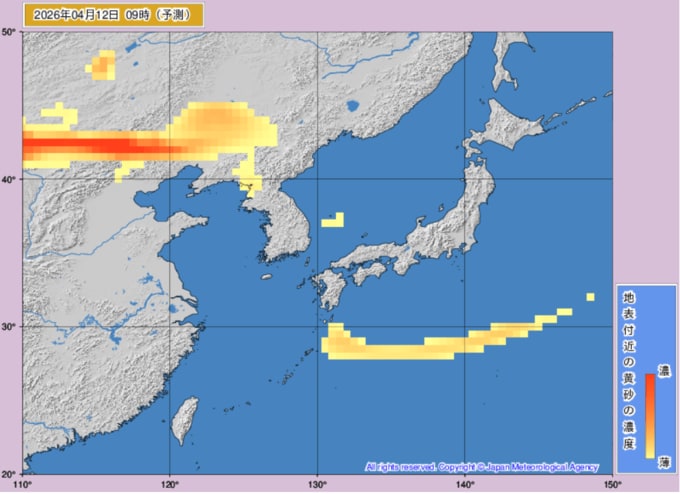 【黄砂情報】週末は日本列島の広範囲に黄砂飛来か...10日~12日の黄砂シミュレーション いつどこに、どれくらい飛んでくる? 黄砂を上空から見たデータで確認 気象庁発表 全国の天気を画像で 2026年4月10日(金) 11:22 国内 ■黄砂はいつ・どこに(12日) ※画像は気象庁より