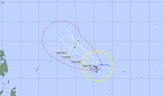 予報円の中心 北緯13度40分 (13.7度)