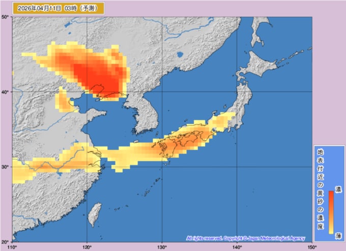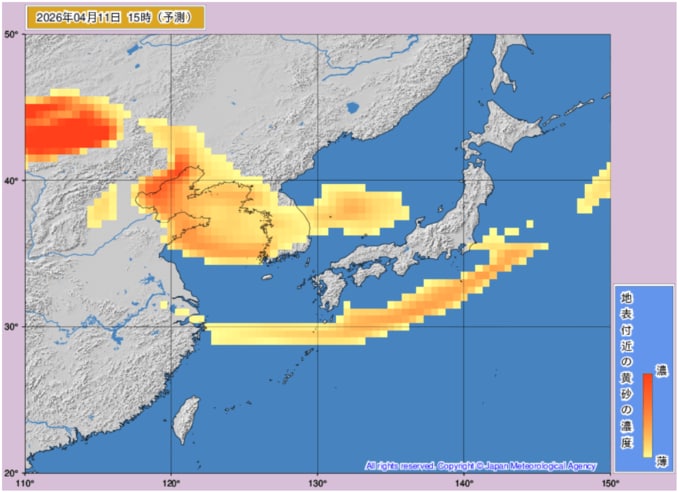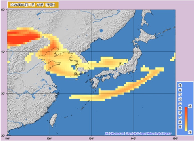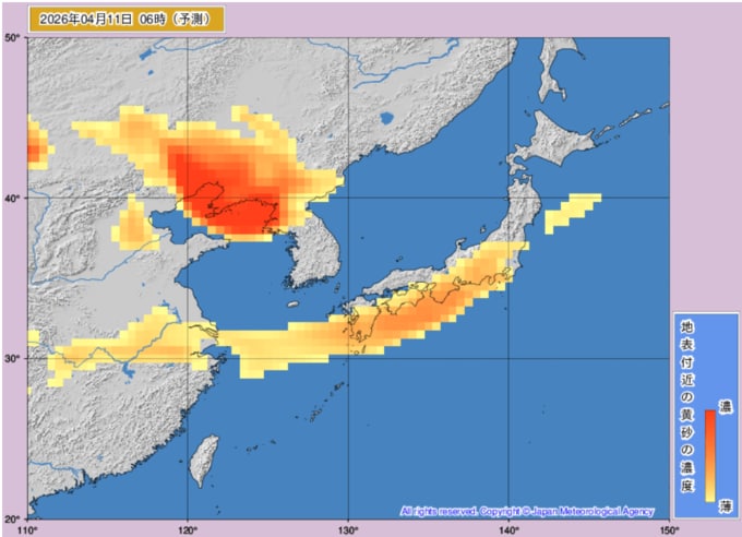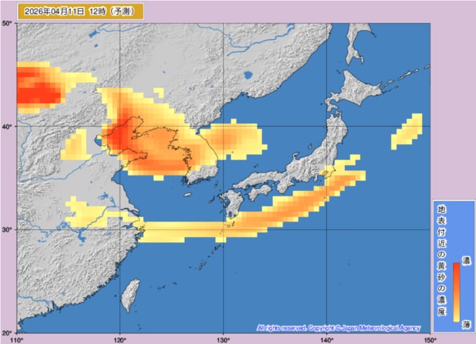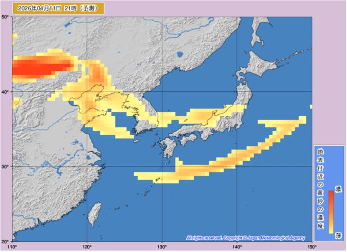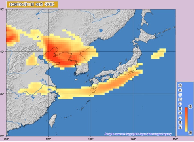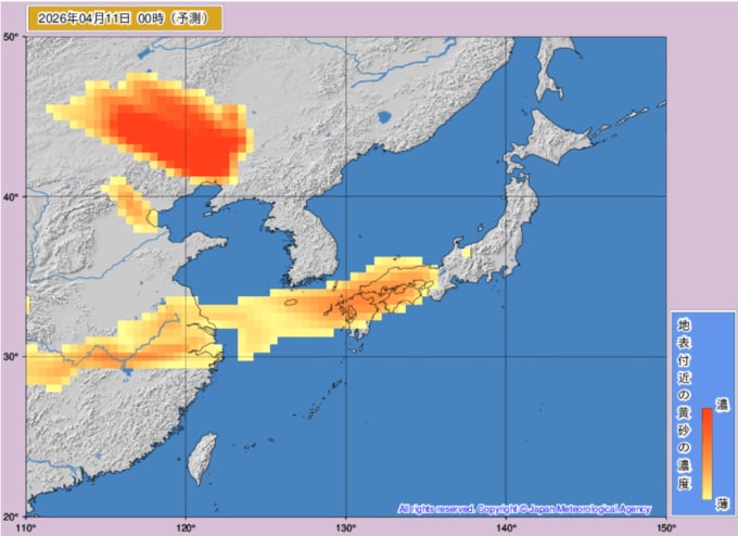 【黄砂情報】今週末は日本列島の広範囲に黄砂飛来か...11日~12日の黄砂シミュレーション いつどこに、どれくらい飛んでくる? 黄砂を上空から見たデータで確認 気象庁発表 全国の天気を画像で 2026年4月10日(金) 21:40 国内 ■黄砂はいつ・どこに(11日)