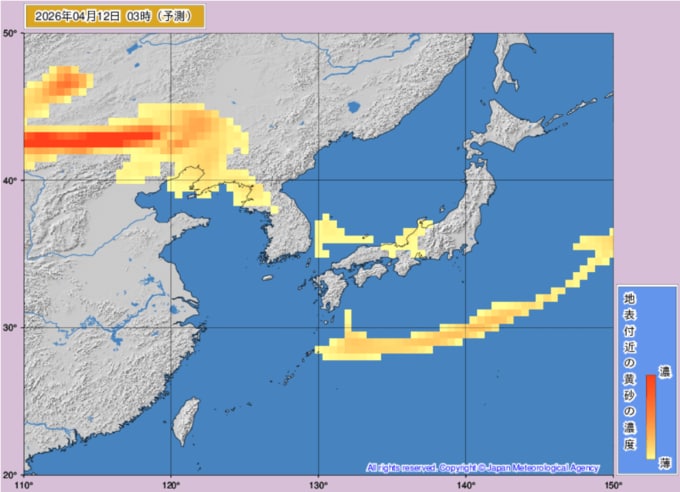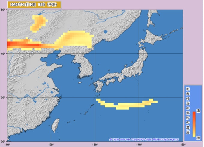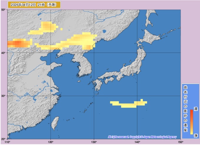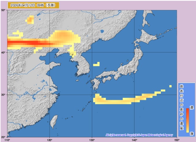 【黄砂情報】今週末は日本列島の広範囲に黄砂飛来か...11日~12日の黄砂シミュレーション いつどこに、どれくらい飛んでくる? 黄砂を上空から見たデータで確認 気象庁発表 全国の天気を画像で 2026年4月10日(金) 21:40 国内 ■黄砂はいつ・どこに(12日) ※画像は気象庁より