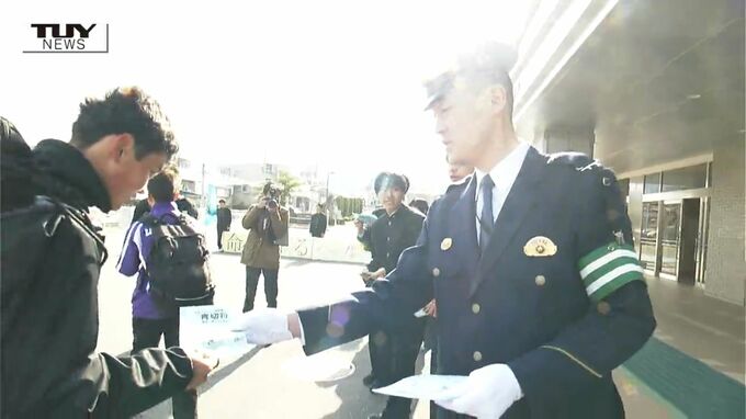 新入学生が慣れない道を走ることで事故が起きるとみられることからきょうは、山形工業の生徒会と警察およそ30人が、通学する生徒に青切符制度を説明するチラシを配ったり、ヘルメットの着用をすすめたりし、交通安全を呼びかけました。