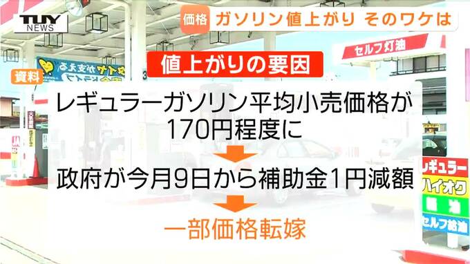県内の値上がりの要因について石油情報センターは、レギュラーガソリンの平均小売価格が政府が目標としてきた170円程度に到達したことなどから、政府は、今月9日から石油元売り会社へ支払う補助金を1円減額していて、これが一部、価格転嫁されたためとしています。