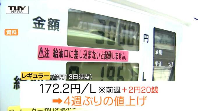 資源エネルギー庁によりますと、今月13日時点の県内レギュラーガソリンの平均小売価格は、1リットルあたり172円20銭で、前の週より2円20銭値上がりし、4週ぶりの値上げ。全国で8番目の高さとなっています。