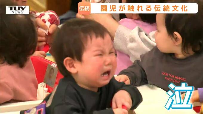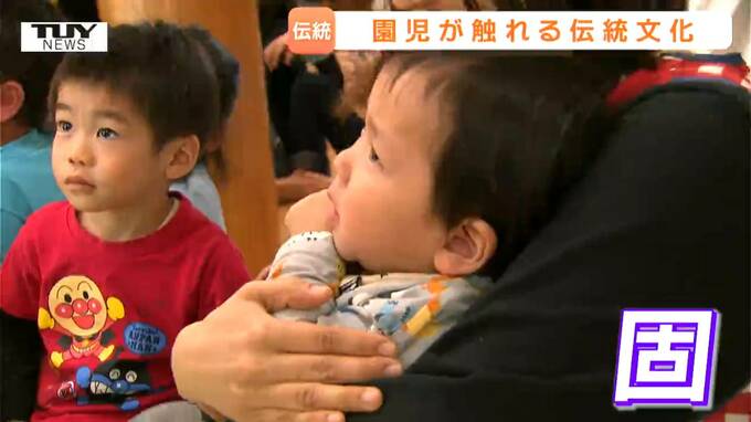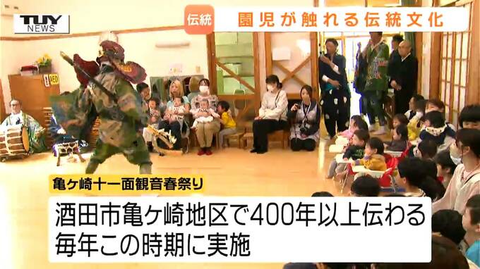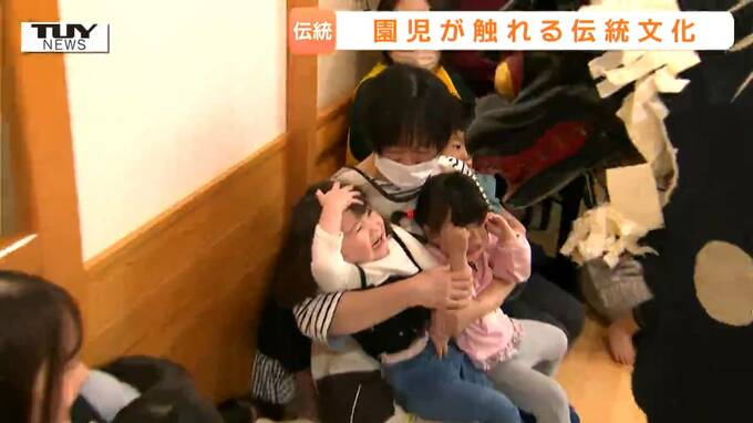 山形県酒田市のこども園で伝統の天狗舞いと獅子舞が披露され、園児が少し怖がりながら迫力ある演舞を見学しました。