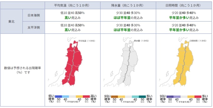 東北日本海側:高い見込み 東北太平洋側:高い見込み