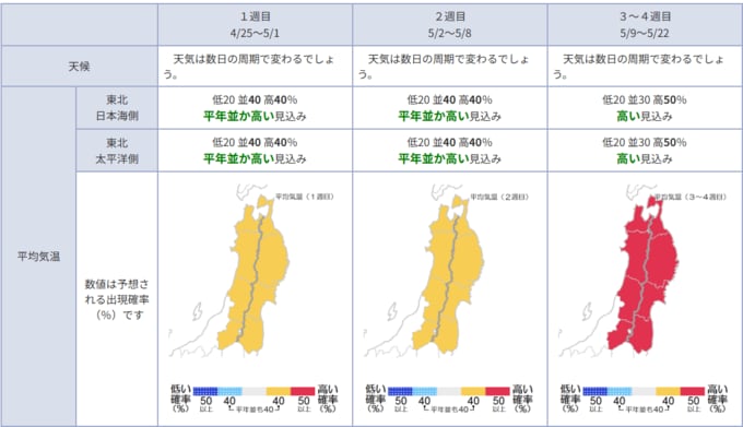 東北日本海側:平年並か高い見込み 東北太平洋側:平年並か高い見込み